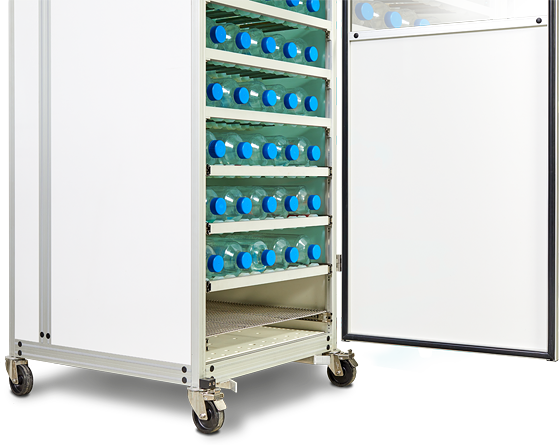 INCUDRIVE 90 comes with castors and is therefore mobile. Production capacity can be adapted by purchasing additional INCUDRIVE 90 devices as needed. Methods, which are generated inside one INCUDRIVE 90 can be scaled up to the number of devices, which are required for the production. Improved safety during production – the risk of problems during cultivation is limited to just the one incubator in question.