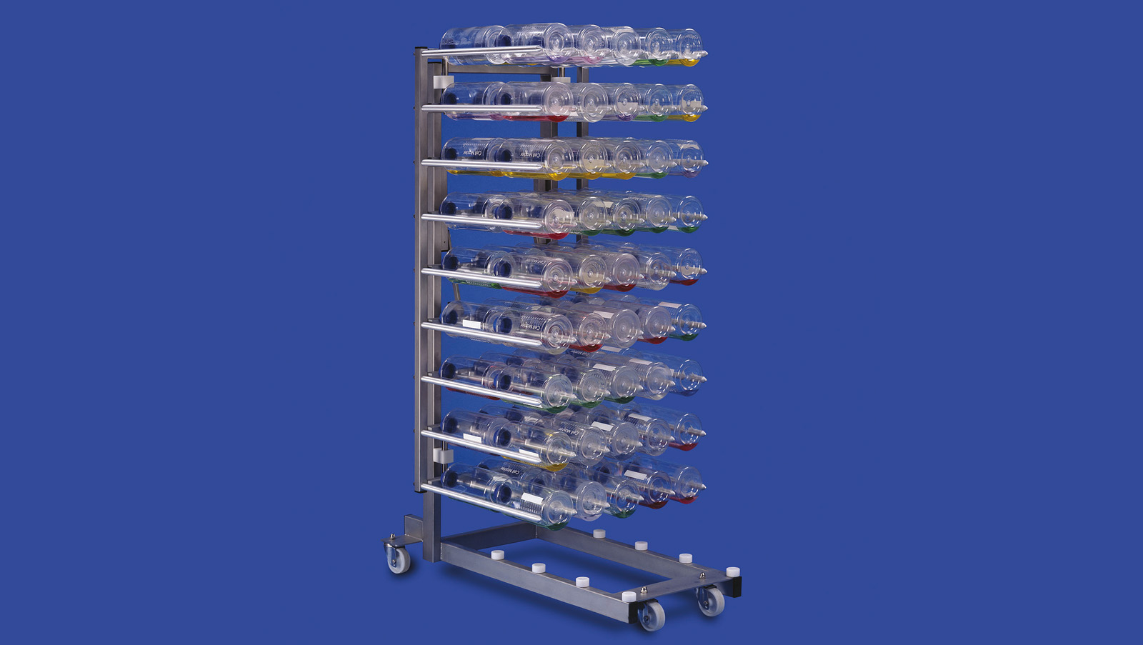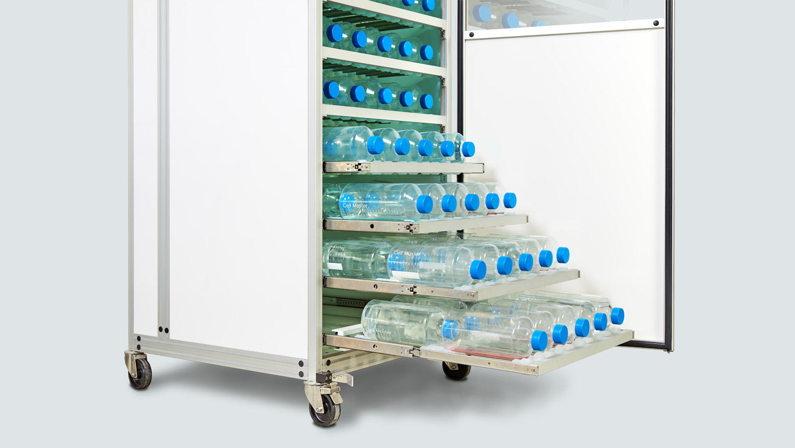 The Bottle-Lifter (optional) allows for all 90 bottles to be loaded or removed simultaneously in only one working step within seconds. The Bottle-Lifter is mobile and sterilizable. It also serves to remove bottles from the incubator and to transport them to a separate room for harvesting, thereby minimizing the risk of crosscontamination.